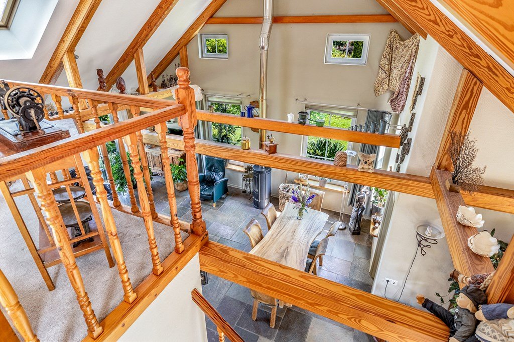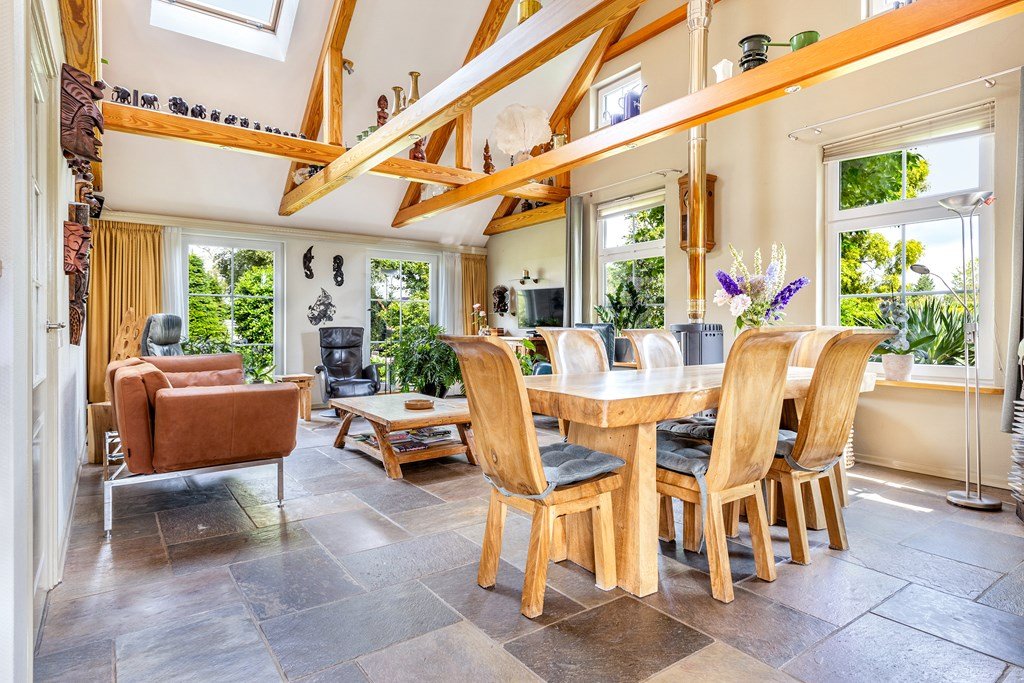 Op de begane grond vinden we o.a. een zeer ruime woonkamer met vide en een plafond tot in de nok. Er zijn veel ramen, waardoor er veel lichtinval is. De woonkamer met openslaande deuren naar het terras, kijkt uit op de prachtige tuin, heeft een leistenen tegelvloer met vloerverwarming en een houtkachel. Hier is ook de trap naar de vide en de toegang naar de kelder.