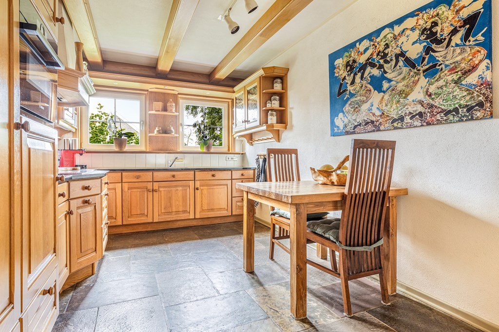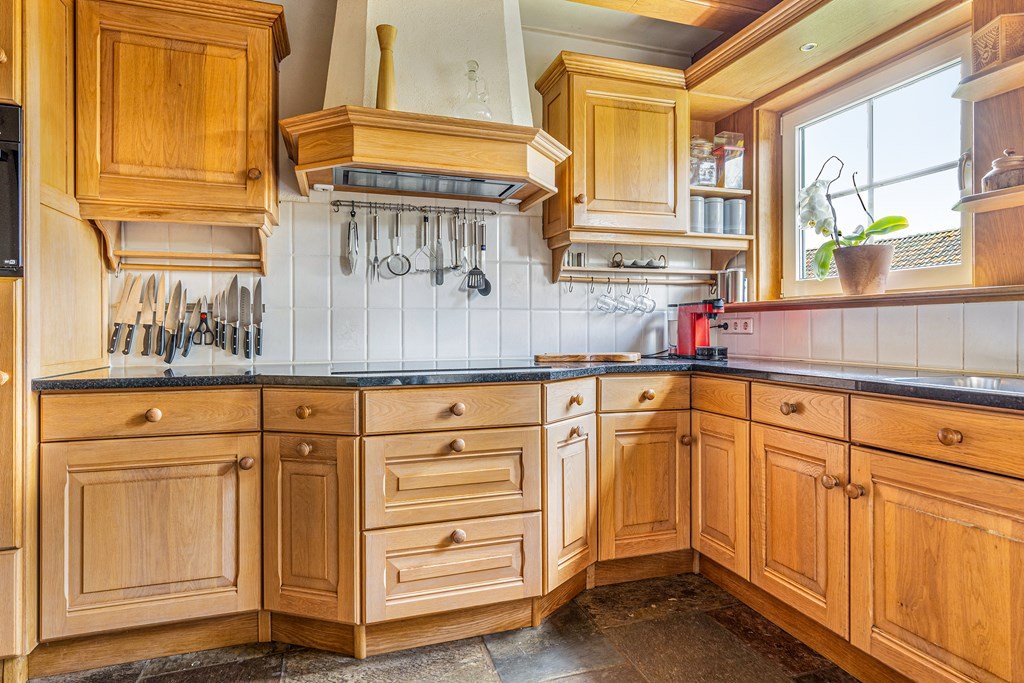 De woonkeuken, massief eiken, heeft een inductiekookplaat, vaatwasser, koelkast, combi-oven en een close-in boiler voor direct warm water. Ook daar vloerverwarming.