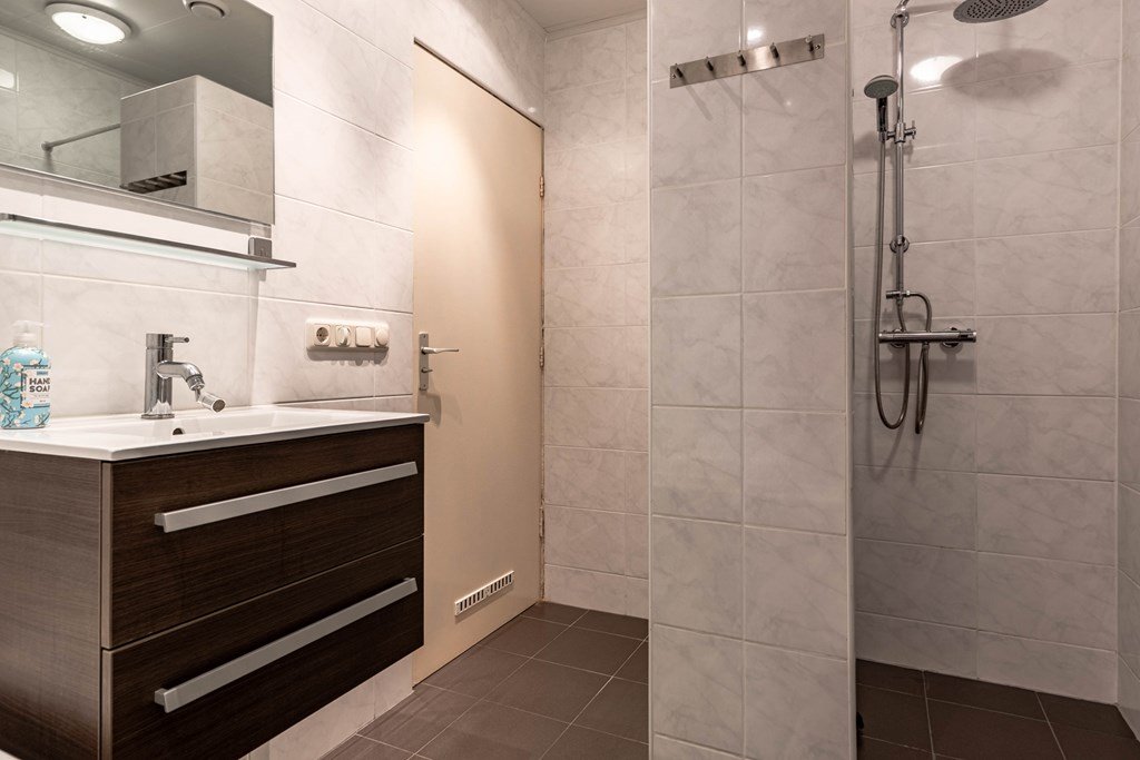 Via de ruime hal, die toegang geeft tot trapopgang, badkamer en separaat toilet, betreed je de woning. De badkamer is uitgerust met een ligbad en douche. De verbouwing van de badkamer dateert uit 2010.