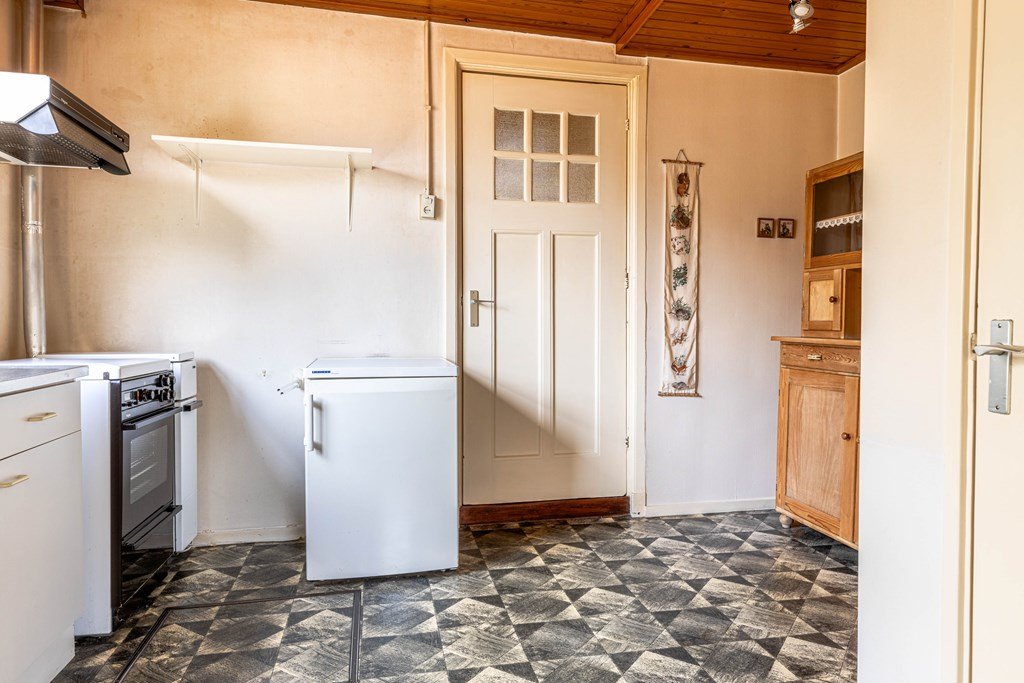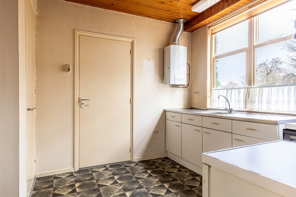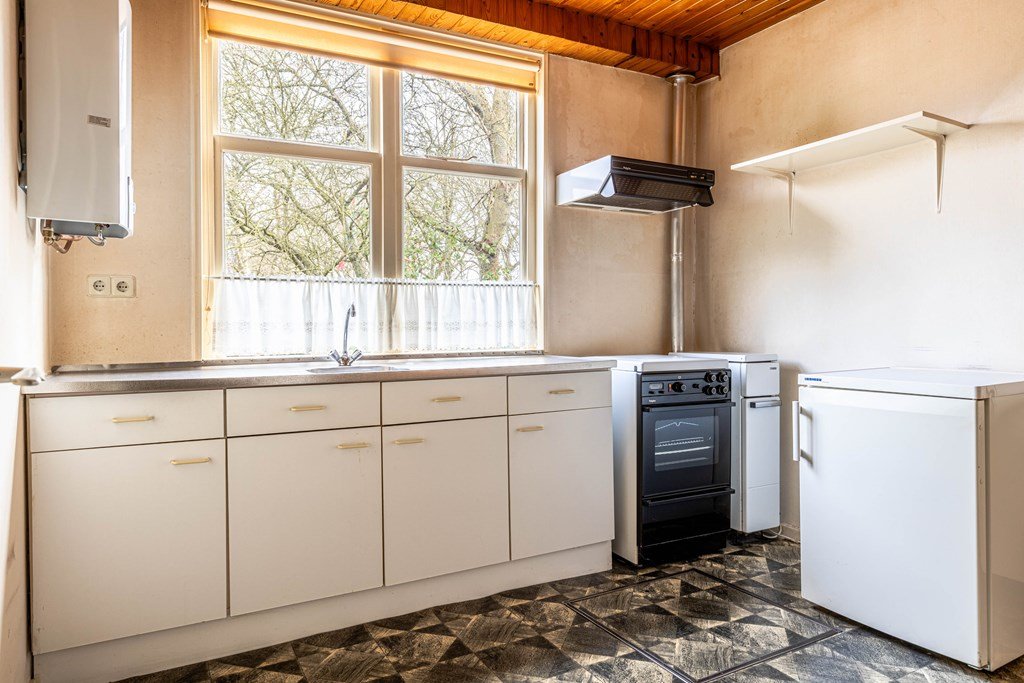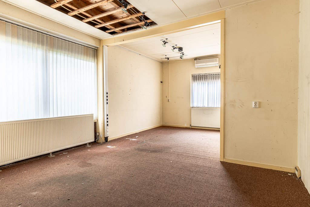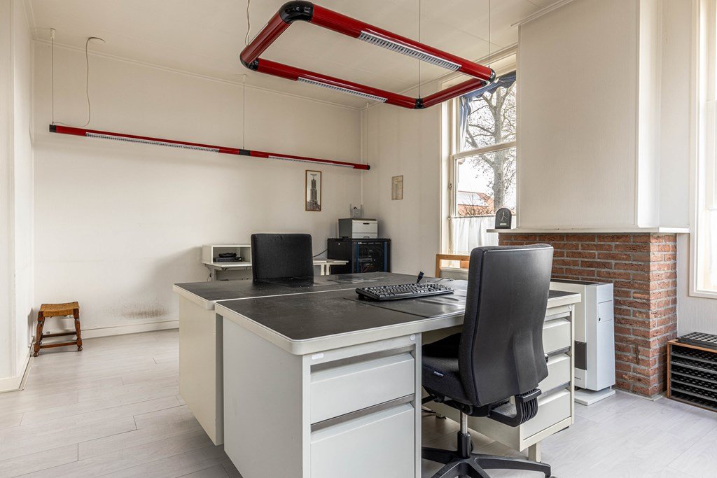 De begane grond kenmerkt zich door een ruime en veelzijdige indeling. Aan deze zijde bevindt zich een woonkamer met open keuken nu in gebruik als kantoorruimte.
